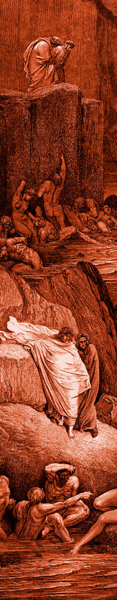 Luogo è in inferno detto Malebolge, tutto di pietra di color ferrigno, come la cerchia che dintorno il volge. Nel dritto mezzo del campo maligno vaneggia un pozzo assai largo e profondo, di cui suo loco dicerò l'ordigno. Quel cinghio che rimane adunque è tondo tra 'l pozzo e 'l piè de l'alta ripa dura, e ha distinto in dieci valli il fondo. Quale, dove per guardia de le mura più e più fossi cingon li castelli, la parte dove son rende figura, tale imagine quivi facean quelli; e come a tai fortezze da' lor sogli a la ripa di fuor son ponticelli, così da imo de la roccia scogli movien che ricidien li argini e ' fossi infino al pozzo che i tronca e raccogli. In questo luogo, de la schiena scossi di Gerion, trovammoci; e 'l poeta tenne a sinistra, e io dietro mi mossi. A la man destra vidi nova pieta, novo tormento e novi frustatori, di che la prima bolgia era repleta. Nel fondo erano ignudi i peccatori; dal mezzo in qua ci venien verso 'l volto, di là con noi, ma con passi maggiori, come i Roman per l'essercito molto, l'anno del giubileo, su per lo ponte hanno a passar la gente modo colto, che da l'un lato tutti hanno la fronte verso 'l castello e vanno a Santo Pietro; da l'altra sponda vanno verso 'l monte. Di qua, di là, su per lo sasso tetro vidi demon cornuti con gran ferze, che li battien crudelmente di retro. Ahi come facean lor levar le berze a le prime percosse! già nessuno le seconde aspettava né le terze. Mentr'io andava, li occhi miei in uno furo scontrati; e io sì tosto dissi: «Già di veder costui non son digiuno». Per ch'io a figurarlo i piedi affissi; e 'l dolce duca meco si ristette, e assentio ch'alquanto in dietro gissi. E quel frustato celar si credette bassando 'l viso; ma poco li valse, ch'io dissi: «O tu che l'occhio a terra gette, se le fazion che porti non son false, Venedico se' tu Caccianemico. Ma che ti mena a sì pungenti salse?». Ed elli a me: «Mal volentier lo dico; ma sforzami la tua chiara favella, che mi fa sovvenir del mondo antico. I' fui colui che la Ghisolabella condussi a far la voglia del marchese, come che suoni la sconcia novella. E non pur io qui piango bolognese; anzi n'è questo luogo tanto pieno, che tante lingue non son ora apprese a dicer 'sipa' tra Sàvena e Reno; e se di ciò vuoi fede o testimonio, rècati a mente il nostro avaro seno». Così parlando il percosse un demonio de la sua scuriada, e disse: «Via, ruffian! qui non son femmine da conio». I' mi raggiunsi con la scorta mia; poscia con pochi passi divenimmo là 'v'uno scoglio de la ripa uscia. Assai leggeramente quel salimmo; e vòlti a destra su per la sua scheggia, da quelle cerchie etterne ci partimmo. Quando noi fummo là dov'el vaneggia di sotto per dar passo a li sferzati, lo duca disse: «Attienti, e fa che feggia lo viso in te di quest'altri mal nati, ai quali ancor non vedesti la faccia però che son con noi insieme andati». Del vecchio ponte guardavam la traccia che venìa verso noi da l'altra banda, e che la ferza similmente scaccia. E 'l buon maestro, sanza mia dimanda, mi disse: «Guarda quel grande che vene, e per dolor non par lagrime spanda: quanto aspetto reale ancor ritene! Quelli è Iasón, che per cuore e per senno li Colchi del monton privati féne. Ello passò per l'isola di Lenno, poi che l'ardite femmine spietate tutti li maschi loro a morte dienno. Ivi con segni e con parole ornate Isifile ingannò, la giovinetta che prima avea tutte l'altre ingannate. Lasciolla quivi, gravida, soletta; tal colpa a tal martiro lui condanna; e anche di Medea si fa vendetta. Con lui sen va chi da tal parte inganna: e questo basti de la prima valle sapere e di color che 'n sé assanna». Già eravam là 've lo stretto calle con l'argine secondo s'incrocicchia, e fa di quello ad un altr'arco spalle. Quindi sentimmo gente che si nicchia ne l'altra bolgia e che col muso scuffa, e sé medesma con le palme picchia. Le ripe eran grommate d'una muffa, per l'alito di giù che vi s'appasta, che con li occhi e col naso facea zuffa. Lo fondo è cupo sì, che non ci basta loco a veder sanza montare al dosso de l'arco, ove lo scoglio più sovrasta. Quivi venimmo; e quindi giù nel fosso vidi gente attuffata in uno sterco che da li uman privadi parea mosso. E mentre ch'io là giù con l'occhio cerco, vidi un col capo sì di merda lordo, che non parea s'era laico o cherco. Quei mi sgridò: «Perché se' tu sì gordo di riguardar più me che li altri brutti?». E io a lui: «Perché, se ben ricordo, già t'ho veduto coi capelli asciutti, e se' Alessio Interminei da Lucca: però t'adocchio più che li altri tutti». Ed elli allor, battendosi la zucca: «Qua giù m'hanno sommerso le lusinghe ond'io non ebbi mai la lingua stucca». Appresso ciò lo duca «Fa che pinghe», mi disse «il viso un poco più avante, sì che la faccia ben con l'occhio attinghe di quella sozza e scapigliata fante che là si graffia con l'unghie merdose, e or s'accoscia e ora è in piedi stante. Taide è, la puttana che rispuose al drudo suo quando disse Ho io grazie grandi apo te?: Anzi maravigliose!. E quinci sien le nostre viste sazie». 1 4 7 10 13 16 19 22 25 28 31 34 37 40 43 46 49 52 55 58 61 64 67 70 73 76 79 82 85 88 91 94 97 100 103 106 109 112 115 118 121 124 127 130 133 136 There is a place in Hell called Malebolge, Wholly of stone and of an iron colour, As is the circle that around it turns. Right in the middle of the field malign There yawns a well exceeding wide and deep, Of which its place the structure will recount. Round, then, is that enclosure which remains Between the well and foot of the high, hard bank, And has distinct in valleys ten its bottom. As where for the protection of the walls Many and many moats surround the castles, The part in which they are a figure forms, Just such an image those presented there; And as about such strongholds from their gates Unto the outer bank are little bridges, So from the precipice's base did crags Project, which intersected dikes and moats, Un