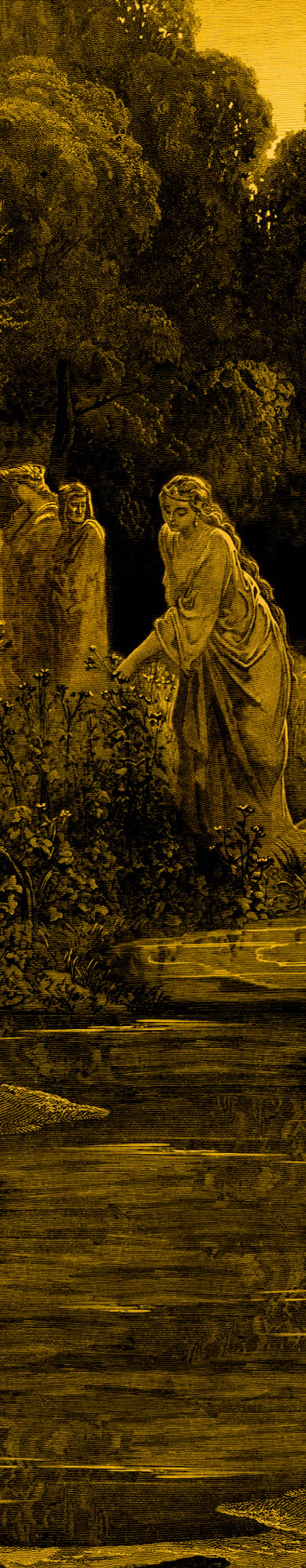 Sì come quando i primi raggi vibra là dove il suo fattor lo sangue sparse, cadendo Ibero sotto l'alta Libra, e l'onde in Gange da nona riarse, sì stava il sole; onde 'l giorno sen giva, come l'angel di Dio lieto ci apparse. Fuor de la fiamma stava in su la riva, e cantava 'Beati mundo corde!'. in voce assai più che la nostra viva. Poscia «Più non si va, se pria non morde, anime sante, il foco: intrate in esso, e al cantar di là non siate sorde», ci disse come noi li fummo presso; per ch'io divenni tal, quando lo 'ntesi, qual è colui che ne la fossa è messo. In su le man commesse mi protesi, guardando il foco e imaginando forte umani corpi già veduti accesi. Volsersi verso me le buone scorte; e Virgilio mi disse: «Figliuol mio, qui può esser tormento, ma non morte. Ricorditi, ricorditi! E se io sovresso Gerion ti guidai salvo, che farò ora presso più a Dio? Credi per certo che se dentro a l'alvo di questa fiamma stessi ben mille anni, non ti potrebbe far d'un capel calvo. E se tu forse credi ch'io t'inganni, fatti ver lei, e fatti far credenza con le tue mani al lembo d'i tuoi panni. Pon giù omai, pon giù ogni temenza; volgiti in qua e vieni: entra sicuro!». E io pur fermo e contra coscienza. Quando mi vide star pur fermo e duro, turbato un poco disse: «Or vedi, figlio: tra Beatrice e te è questo muro». Come al nome di Tisbe aperse il ciglio Piramo in su la morte, e riguardolla, allor che 'l gelso diventò vermiglio; così, la mia durezza fatta solla, mi volsi al savio duca, udendo il nome che ne la mente sempre mi rampolla. Ond'ei crollò la fronte e disse: «Come! volenci star di qua?»; indi sorrise come al fanciul si fa ch'è vinto al pome. Poi dentro al foco innanzi mi si mise, pregando Stazio che venisse retro, che pria per lunga strada ci divise. Sì com'fui dentro, in un bogliente vetro gittato mi sarei per rinfrescarmi, tant'era ivi lo 'ncendio sanza metro. Lo dolce padre mio, per confortarmi, pur di Beatrice ragionando andava, dicendo: «Li occhi suoi già veder parmi». Guidavaci una voce che cantava di là; e noi, attenti pur a lei, venimmo fuor là ove si montava. 'Venite, benedicti Patris mei', sonò dentro a un lume che lì era, tal che mi vinse e guardar nol potei. «Lo sol sen va», soggiunse, «e vien la sera; non v'arrestate, ma studiate il passo, mentre che l'occidente non si annera». Dritta salia la via per entro 'l sasso verso tal parte ch'io toglieva i raggi dinanzi a me del sol ch'era già basso. E di pochi scaglion levammo i saggi, che 'l sol corcar, per l'ombra che si spense, sentimmo dietro e io e li miei saggi. E pria che 'n tutte le sue parti immense fosse orizzonte fatto d'uno aspetto, e notte avesse tutte sue dispense, ciascun di noi d'un grado fece letto; ché la natura del monte ci affranse la possa del salir più e 'l diletto. Quali si stanno ruminando manse le capre, state rapide e proterve sovra le cime avante che sien pranse, tacite a l'ombra, mentre che 'l sol ferve, guardate dal pastor, che 'n su la verga poggiato s'è e lor di posa serve; e quale il mandrian che fori alberga, lungo il pecuglio suo queto pernotta, guardando perché fiera non lo sperga; tali eravamo tutti e tre allotta, io come capra, ed ei come pastori, fasciati quinci e quindi d'alta grotta. Poco parer potea lì del di fori; ma, per quel poco, vedea io le stelle di lor solere e più chiare e maggiori. Sì ruminando e sì mirando in quelle, mi prese il sonno; il sonno che sovente, anzi che 'l fatto sia, sa le novelle. Ne l'ora, credo, che de l'oriente, prima raggiò nel monte Citerea, che di foco d'amor par sempre ardente, giovane e bella in sogno mi parea donna vedere andar per una landa cogliendo fiori; e cantando dicea: «Sappia qualunque il mio nome dimanda ch'i' mi son Lia, e vo movendo intorno le belle mani a farmi una ghirlanda. Per piacermi a lo specchio, qui m'addorno; ma mia suora Rachel mai non si smaga dal suo miraglio, e siede tutto giorno. Ell'è d'i suoi belli occhi veder vaga com'io de l'addornarmi con le mani; lei lo vedere, e me l'ovrare appaga». E già per li splendori antelucani, che tanto a' pellegrin surgon più grati, quanto, tornando, albergan men lontani, le tenebre fuggian da tutti lati, e 'l sonno mio con esse; ond'io leva'mi, veggendo i gran maestri già levati. «Quel dolce pome che per tanti rami cercando va la cura de' mortali, oggi porrà in pace le tue fami». Virgilio inverso me queste cotali parole usò; e mai non furo strenne che fosser di piacere a queste iguali. Tanto voler sopra voler mi venne de l'esser sù, ch'ad ogne passo poi al volo mi sentia crescer le penne. Come la scala tutta sotto noi fu corsa e fummo in su 'l grado superno, in me ficcò Virgilio li occhi suoi, e disse: «Il temporal foco e l'etterno veduto hai, figlio; e se' venuto in parte dov'io per me più oltre non discerno. Tratto t'ho qui con ingegno e con arte; lo tuo piacere omai prendi per duce; fuor se' de l'erte vie, fuor se' de l'arte. Vedi lo sol che 'n fronte ti riluce; vedi l'erbette, i fiori e li arbuscelli che qui la terra sol da sé produce. Mentre che vegnan lieti li occhi belli che, lagrimando, a te venir mi fenno, seder ti puoi e puoi andar tra elli. Non aspettar mio dir più né mio cenno; libero, dritto e sano è tuo arbitrio, e fallo fora non fare a suo senno: per ch'io te sovra te corono e mitrio». 1 4 7 10 13 16 19 22 25 28 31 34 37 40 43 46 49 52 55 58 61 64 67 70 73 76 79 82 85 88 91 94 97 100 103 106 109 112 115 118 121 124 127 130 133 136 139 142 As when he vibrates forth his earliest rays, In regions where his Maker shed his blood, (The Ebro falling under lofty Libra, And waters in the Ganges burnt with noon,) So stood the Sun; hence was the day departing, When the glad Angel of God appeared to us. Outside the flame he stood upon the verge, And chanted forth, “Beati mundo corde”, In voice by far more living than our own. Then: “No one farther goes, souls sanctified, If first the fire bite not; within it enter, And be not dea